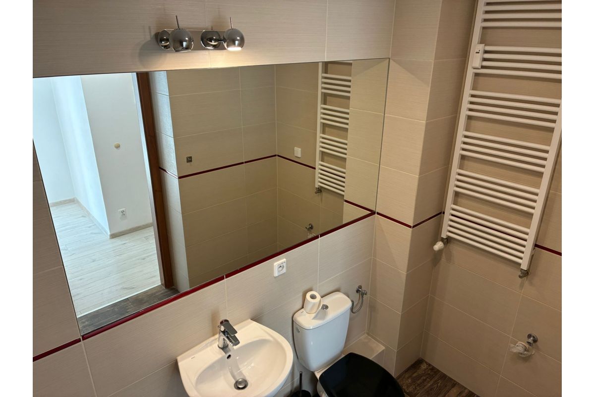 - ŁAZIENKA o powierzchni 4,32m² z wc, wanną i umywalką oraz dużym lustrem; w łazience glazura i terakota;